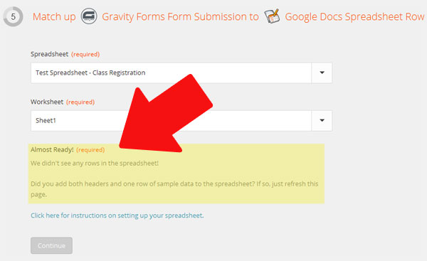 Step 5: Then it was time to match up my form to my Google Docs spreadsheet Row. Before you get to this step, you need to actually create your spreadsheet in Google Drive.