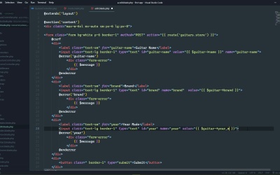 Editing is very much like creating. We are working with the same data. We are almost doing the same exact processes. There's just a slight difference between the two, but other than that they are the same. So there's going to be a lot of copying and pasting. So let's start by showing our form. Now, well actually we should start with the show method because this is still showing the data that is hard coded. So let's do that, let's go to the individual page of the guitar. We can see that is not right. So here's what we can do. We can fetch the data from the database using our guitar model. There's a find method that we could pass the ID to, and then it's going to find the record with that ID. And then we would have a record, then we could check if it existed and if not then we get a 404. Otherwise, we pass that record on to the view, that's fine. An alternative is this find or fail. Almost the exact same thing except that it is going to automatically fail and return a 404 if it can't find that record. So in fact, we could inline this so that our show method is going to be very, very clean. So there's nothing like code that works, except clean code that works. So there we go. We have that same exact functionality. If we go back to the browser, this is of course going to show data from the database except that it's not because, that was a syntax error, but now we can go back and there it is. We do need to add the year there because since we are going to be editing this information, I wanna be sure that we show all of the information that we have. So actually, we could copy this from the index view and we could paste that inside of the show view. And that will be fine. For our edit action method, we can essentially do the same thing except that we want to display a different view, we want to display the Edit View. And we need to change the parameter name to guitar, but other than that that's going to be fine. Now our edit view is going to be a copy of the Create View because remember, this is the same exact data. So the Create Form is already there ready for us to use. We'll just copy it and use it as the basis for our edits form. Now, we don't want to display the old information because that was what the user typed into the form field after they submitted it the first time and validation failed. Instead, what we wanna show is the data coming from the database. So we are going to be working with the guitar that is passed to this view. And I'm going to use object property syntax here. We could use the associative array syntax if we wanted to. That's what we did inside of the index and show views. However, just to show you that we could use this other syntax. I'm going to use object, property syntax. Of course, in your applications, pick one and stick with it. Consistency is very important. All right, so we will have the name, we'll have the brand. And then finally, the year made and for the most part, that's it. We do need to change how this form is submitted because it is currently being submitted to the guitars store route. We want the update route. But we also need to supply the guitar that is going to be updated so we need to include that. That is coming from the guitar object. And we can provide the ID there. And that is the completely wrong syntax we want arrow there. But that's going to give us the correct URL. The other thing that we need to change is the method. We want to use a put because put requests are for updating data. However, browsers don't understand put when it comes to a form submission. It only understands get and post. So we have to emulate a put request by using a blade function called method. We pass in the HTTP method that we want to emulate, and then we're good to go. So even though this is an actual post request, our application is going to accept the request. It's going to see that we want to emulate a put request. And it's going to route it to the update route. So everything is going to be just fine. So if we go to /guitars/ID/edit, we should see our form and we do. If we go to the guitars/2/edit, we should see that other guitar. If we go to /3, which does not exist, we should get a 404. And there we go. So we are good to go there. So now we just need to write the code that's going to handle the submission. And for the most part, we can almost copy the exact same code from the store method and use that because we still want to validate the user input. We are still going to need to assign values for name brand you're made. The only difference is, we need to fetch the guitar from the database as opposed to creating a new guitar. So we are going to copy this entire thing and we're going to paste it inside of our update method. And instead of creating a guitar, we are going to fetch it from the database, but once again, we are going to use this find or fail. Because if the record doesn't exist we don't want to do anything we want to 404 there. So we do need to change the name of this variable because guitar is the parameter with the ID. So we are going to use record here and we're going to save it. As far as the redirection, I think it makes more sense to redirect to the show route. But we also need to supply the ID and we can do that with just the guitar there. So now let's just test this and make sure that it's actually going to work. So we could edit the name. Let's also edit the year, but remember that the year has to be an integer value. So let's do something that's very different, 2000. So if we submit this, we should be taken back to the page for that guitar. We can see that the name is different. We can see that the year is different. So we successfully updated that data. Now as I mentioned at the beginning of this lesson there's a lot of repetition because these processes are almost identical. So in the next lesson, we are going to start to see how we can eliminate some of that duplication.