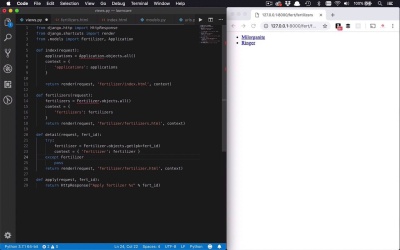 The next thing that we're gonna do is we're gonna work on the detail function so we can actually start to get more information about a particular fertilizer. This is gonna bring into light another function, another way or thing that we're gonna have to do to retrieve data from the database. And we're gonna look for something by a unique identifier. So as you saw before with these links that we created, if I hover over, you can see the Milorganite down the bottom left is at fertilizers/1, which means its unique identifier is 1. And Ringer is 2. So wanna be able to find individual fertilizers or individual objects in the database, regardless of what they are, by a unique identifier. And it's actually pretty simple. So let's go ahead into our Detail function. And we wanna do something similar to what we've been doing before, is I actually wanna look for a particular fertilizer. So there's a number of different ways that you can do this. But what I typically like to do, or the pattern that I like to follow when retrieving an individual item is looking for that individual thing by an ID. And if for some reason we find that it doesn't exist, then I want to raise an exception. And I want to tell the user at the other end that this object doesn't exist. And typically the way that you do that in web applications is by responding with an HTTP response code of 404, meaning not found. So that sounds like a lot, but how do we do that? Well it's actually not too hard. The way that I like to do it is I like to use a try except block, just like this. And within here, I'm gonna say, all right, I wanna get a fertilizer, and I want it to be an individual fertilizer. So I'm gonna go into my fertilizer model, and I'm gonna say objects once again. But this time, instead of saying all, cuz I don't want all of them. I want to use a get function. And I can use a get function and search for an individual item by the primary key by using PK equal to. And then I can say what am I passing in, what's the id, is that fert_id. So I can look for an individual item that way. So let's just continue down the happy path and say, all right, if that fertilizer does exist, what do I wanna do? Well, I wanna do the same things that I've done before. I'm gonna create a context, I'm going to set that = to fertilizer. And its object is going to be fertilizer, the value of that particular key in the context is going to be fertilizer. So now I have that, so what can I do at this point? Well, just like I've done before, I'm going to come down here, assuming that everything works properly. And I'm simply gonna return render. And I'm gonna pass into that my request. I'm gonna pass into it fertilizer/fertilizer.html. And then I'm gonna pass in the context. So that should work if that particular fertilizer does exist. But what happens if it doesn't? Well, if I try to get a particular fertilizer by a primary key, or honestly, any other model in the database by a primary key, and it doesn't exist, I'm gonna get an exception. And that exception is of a particular type. In this case, it's gonna be my type or my model .DoesNotExist, just like that. And if that happens, then I wanna handle this properly. And like I said before, typically what you're going to do is you're going to raise a 404 exception. Now, Django actually has something built in to handle that. So I could go up to from django.http import, I want to import that HttpResponse. Which I'll be able to get rid of pretty soon, cuz we're not using it anymore except for in this apply now. But I also want to have HTTP 404. So this is a special exception that we can raise or return so that we can let the user on the other end of the page know that something went wrong. So I'm gonna say raise Http404. And I could pass in to it a string to say what happened. And I can say, fertilizer does not exist, just like that. So that'll work, so I go ahead and save that. Now obviously, if I come back over here, refresh my page. We're gonna see that we have some issues going on here. And I forgot a semicolon there. So we'll go ahead and save that. Let's refresh our page, we get our list here. And if I click on one of these, we're gonna see a Page not found, because we don't have a template that's matching what we're looking for right here. So let's go ahead and fix that. We'll come on in here to our fertilizer. We'll create a new file, just like we've done before, fertilizer.html. And then in here, and we'll just drop a little bit of markup in here, nothing too crazy. We have an h1, which is gonna display the fertilizer name. And then we have some other information about it. We have the bag weight, we have the bag coverage. And then we're just kinda displaying that data. So let's go ahead and save these changes. So now we have that template. I should be able to come over here and refresh this page. And now you can see that I can now see the name of the fertilizer as well as some information about it. And that's pretty nice. But the reason that we put our check into our view for this 404 is what happens if we search for something that doesn't exist? So I can come over here to Ringer, that has an ID of 2. And that works out pretty nicely. But, if I were to come back over here and I could say I want to go to 3. And if I go ahead and try to do that, you're going to see that I get to this 404 Page not found. And here's the little error that I passed along with it. I say, fertilizer does not exist. So that's pretty nice. So now I can start to create these error pages to let the end user know, hey, that page doesn't exist or this thing doesn't exist, and give them a little bit more information about it. So as far as the views, we're getting pretty close to the end. What I wanna do next is I wanna take a few minutes to talk to you about how we can now start to work with applying these fertilizers. And basically the process of doing that in any sort of web application is providing a form. And we wanna put a form