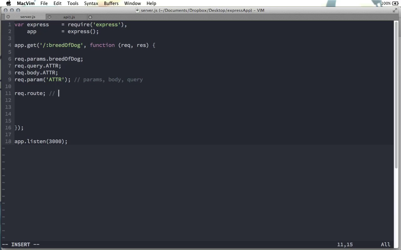 Throughout this screencast, we've pretty much taken the request and response objects for granted. But there's a lot that they can do that we haven't looked at yet. So in this screencast, I'm gonna go over some of the highlights of those objects, some of the things that you're most likely to use. Now we're not gonna cover everything from the request or the response objects, but we'll look at some of the things that you're most likely to use in your applications. First, there is the params object, request.params.attribute name. As we already saw, any tokens that we create in our actual route will be available as parameter names. So, for example, if I have :breed of dog in the route, then request.params.breedOfDog will be available on the request.params object. There's also the request.query object. Now if you're not familiar with a query string, this usually comes in the form of a question mark, followed by an attribute name, equals sign, and an attribute value, for example, name equals Andrew. And this, of course, would not actually be part of the route that you define here, but that might be sent back from the browser to the server. And if there is a query string, like that, after the actual route name, you can use the request.query object to get those attributes out of the URL. We also saw request.body, which of course to access, you'll need some body parsing middleware, but you can use that with put or post requests to get attributes from the body of an HTTP request. These three things kind of work together with the request.param method. You pass the attribute name as a property to the request.params method, and it will look first in request.params, then in request.body, and finally, in request.query to see if we find anything that matches that attribute name. So if you're not sure which one of these three ways that value is gonna be sent to this route function, well then you can use the params object and it will check all three of them. As I said, it will check in the order of params, body, and then query. If you need to find out more information about the route that was used to call whatever function you're currently inside, request.route is an object that has several useful properties. As you might guess, these routes are parsed with Express using regular expressions. So it will have the regular expressions that were used, as well as a list of the parameters, other keys, along with the full path name. But if all you want is the actual route string that was used, you can use request.originalUrl, only the U being capitalized there. And that will just be a string that gives you that route that was called. So instead of saying /:breedOfDog it would say /Great Dane or /Chihuahua. If you have cookie parsing middleware involved, you can use the request.cookies object to get any cookies that you might be using in your current session. Also useful is the request.get function. You can pass this function any header name, and it will turn the value that header was in this HTTP request's object. The request object also has methods that are for specific request headers. The one I'll mention here is the request.accepts method. As you know, an HTTP request usually states certain types of content that it is able to accept as a response. And you can use this to return a boolean to find out what type of request is acceptable. So, for example, you can say does this accept text/html, and if it does accept that, this will return true. Other mime types are available, of course, so you could do application/JSON or text/plain, something like that. So these are a few of the most common methods that you're gonna use when you're building your application. However, you can find a complete list if you go over to expressjs.com and look at the API. As you can see over on the side here, you can click Request and here's a whole list of them. A few of the ones I didn't mention is req.ip, which turns the remote address of the request that was used. You can also use req.protocol to find out what protocol was used. Req.secure will return true if HTTPS was used. And there are a few others that you probably won't use very often that you can find on this page. So there's a quick look at some of the Express request objects that you can use to make developing your application a little bit easier.