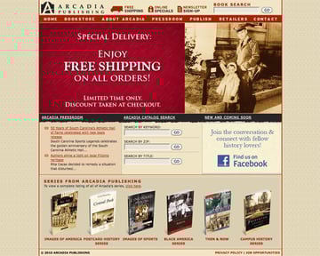 Arcadia Publishing's site fits its business perfectly. It has a vintage feel to it, which fits them since they're publishers of historical nonfiction. The site is easy to navigate and effectively showcases important information (like the fact that they offer free shipping).