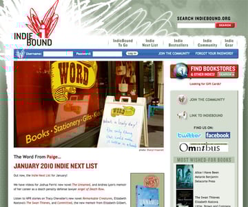 IndieBound is a community for independent bookstores and their customers. Their site is well-laid-out, has a great color scheme, and a unique design. They have a lot of information on the site, but it remains easy to navigate and find the information you need. They even manage to make the wide variety of graphics used on the site appear cohesive.