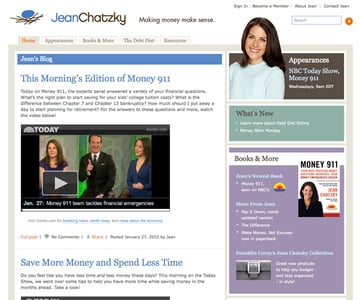 Jean Chatzky's website is well-suited to the types of books she writes and the brand she's built for herself (you may recognize her from her regular appearances on the Today Show). It's professional but unintimidating and has a friendly feel to it. It also provides all the necessary information you'd expect and is easy to navigate.