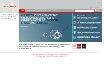 Jim Collins' site takes a much more minimalist design approach than many of the others on this list. The color scheme is limited and sophisticated, there's plenty of white space, and only necessary content is included.
