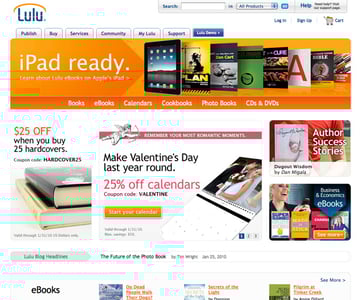 Self-publishing company Lulu has a well-designed website that focuses on user experience. They keep graphics simple and use them specifically to highlight their services. The color scheme is consistent (white, blue and orange), and there's plenty of negative space in the design. What sets Lulu's site apart from many other self-publishing sites is that they've made it just as easy for book buyers to use the site as they have for authors.