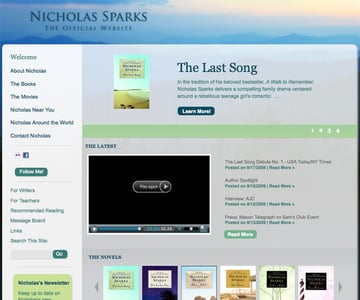Nicholas Sparks' website makes great use of large background images and transparency. It's easy to find the information you might be looking for, with prominent links to his books and movies, as well as appearances and biography information.