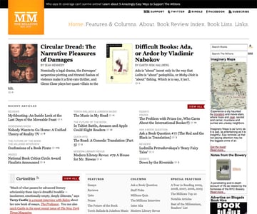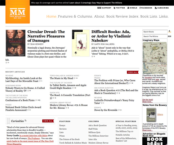 The Millions is a book review and culture site that uses a grid layout and mostly-black and white color scheme with bright orange accents. The layout of the site is fantastic, and the entire thing feels very modern and refreshing.