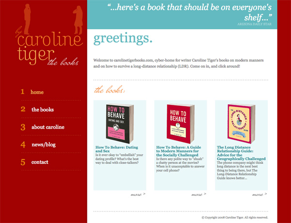 Caroline Tiger's site has some of the best use of color of any author site I've seen. Navigation is simple and straightforward, the emphasis is placed squarely on her books, and the overall impression is professional but relaxed.