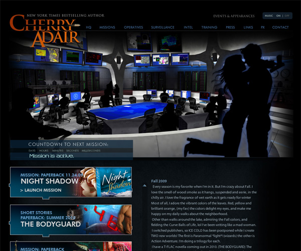 Cherry Adair's website fits well with the types of books she writes. The only downside to the site is that it's entirely Flash-based, though the interface itself is slick and very responsive. She includes all of the information one would expect on an author site, including a printable, PDF booklist.
