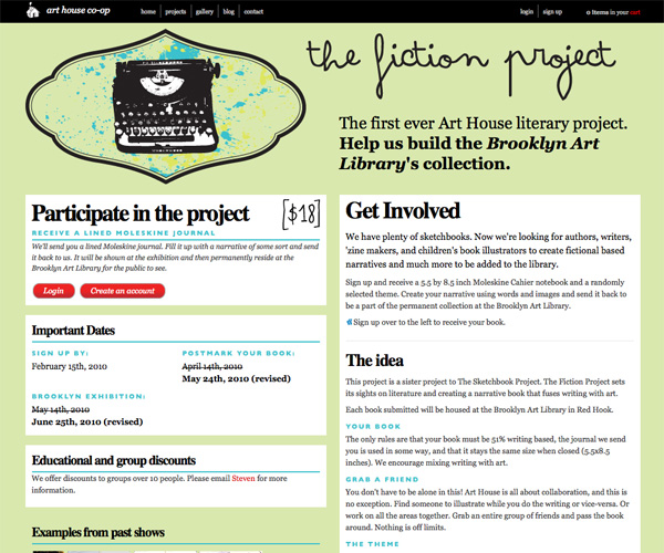 The Fiction Project at Art House Co-Op has a really awesome site design. The overall look represents the artistic sensibility of the project, but all information about the project is easily found and legible.