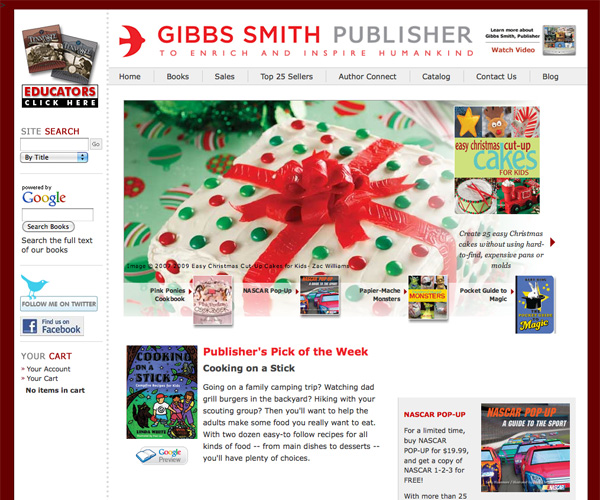 Gibbs Smith makes great use of Flash to showcase books on their home page, but otherwise keeps their layout fairly simple. They emphasize their best-sellers but make it easy to browse their entire catalog or find information about their authors. The red, burgundy and gray color scheme is sophisticated and feels very neutral.