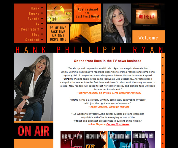 Hank Phillippi Ryan's website is bright and colorful, which matches the covers and style of her books. The layout is reminiscent of a grid layout and makes good use of negative space.