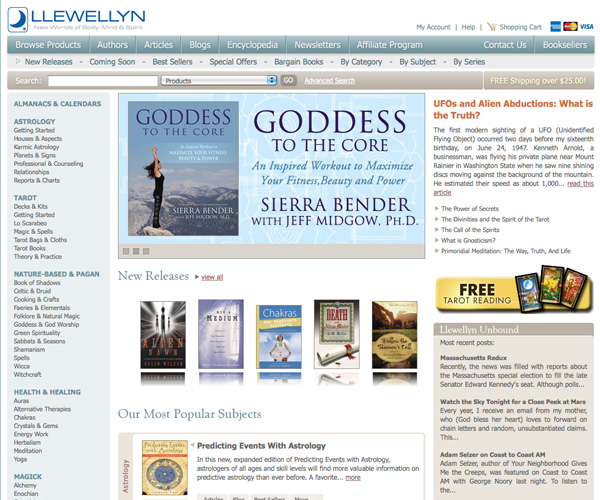 Llewellyn's website uses a muted color palette and three column layout that creates a sophisticated and professional feel to their site. They make it easy to browse their books, as well as to find other information about the company and their authors.