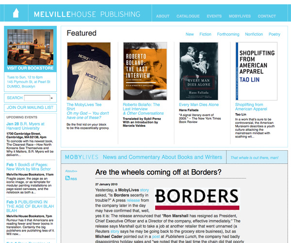 The Melville House Publishing website has a simple blue and white theme throughout. It has a minimalist, grid-based layout nad a lot of white space. Information is easy to find and their books are displayed prominently.