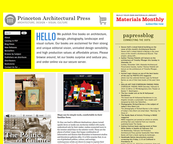 Princeton Architectural Press's website is great because it's design is a bit unexpected. The bright yellow background and grid-based layout are visually striking, which is entirely appropriate for a publishign company that focuses so heavily on design, but also a bit unexpected for a site in such a conservative industry.