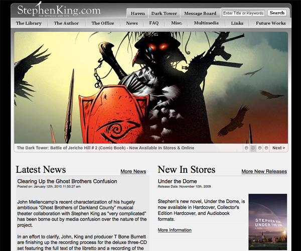 Stephen King's presents its own challenges to a designer, mainly the sheer volume of information it needs to contain. King has written well over sixty books, has had a number of his books adapted for the screen, and has written numerous short stories. But his site manages to include all the pertinent information a visitor might be looking for while also showcasing his best and most recent works, all while maintaining a very streamlined and professional design.