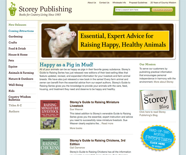 Storey Publishing is another company that opted for a muted color palette and simple layout. The green accents on the site fit well with the country-living and outdoor-themed books they publish, as do the graphics throughout the site.