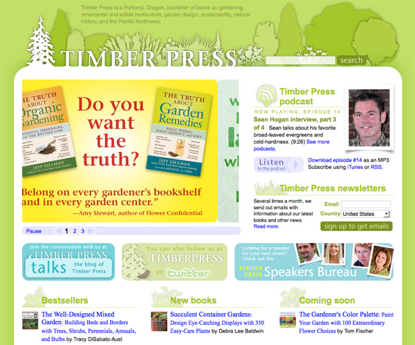 The Timber Press website makes great use of color and has a fantastic layout. The design is eye-catching and easy to navigate, with a well-implemented slideshow showcasing some of their books on the home page.