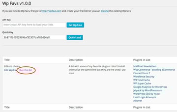Either way, once it finishes loading you will get the Wp Fav details, including a small description written by the author of the list and the plugins included. If you are happy enough to continue simple click on "Run the list".