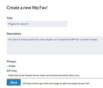 It's time to create a Wp Fav list, so head to the "My Wp Favs" page and click on the "Create a Wp Fav" button. You will get something like: