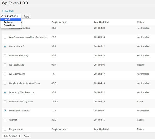 The idea behind Wp Favs is to have all your plugins organized in a list to be able to install them all at once - or with just a few - simple clicks. Okay all this sounds great, but how does it actually work?