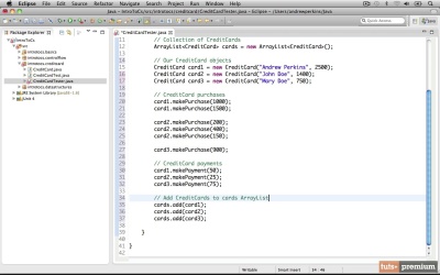 In this lesson, we’ll take what we’ve learned about data structures and use an array list in our CreditCardTester class to create a collection of credit cards. We’ll also clean up our CreditCardTester‘s code and output. Finally, we’ll learn how we can join two values together using concatenation.