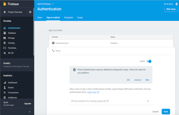 First, navigate to Sign-in method, click on Phone, and enable it. You'll see a screen like this: