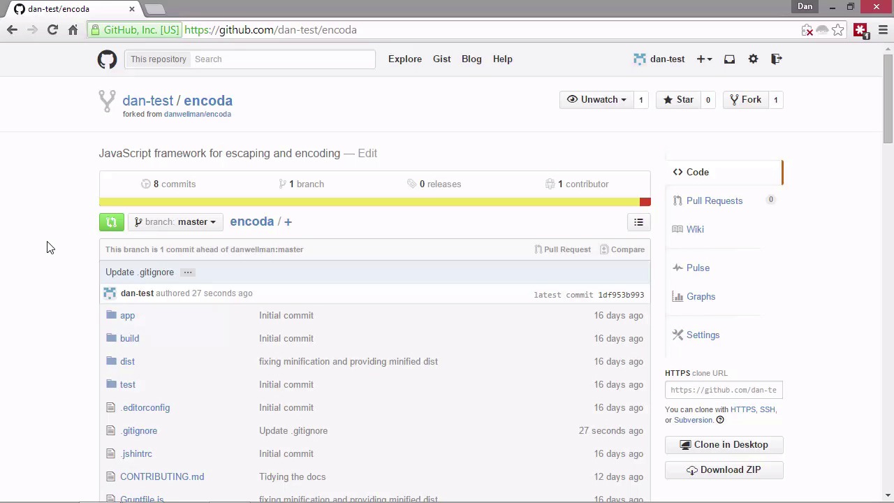 Hi, folks. In this lesson, we're gonna look at a very important aspect of GitHub. And that is contributing to other repositories and handling contributions from other people. Sharing code is one of the big pluses of GitHub, so these are good things to learn early. So let's look at contributing to other repositories first. This could be the reason why you wanted to learn Git in the first place after all. To contribute to an open source framework, or library. So lets go back up to GitHub. [BLANK_AUDIO] So we need to find a repository that we'd like to contribute to. Remember earlier in the course that I mentioned I already have a personal GitHub account. Well, I've got a library here on my regular GitHub account, so let's see how we would contribute to that. [BLANK_AUDIO] So, this is my main GitHub account. I'll just go danwellman and the framework or library that it will fit together is called encoda. That's not important. What is important is that when we want to contribute to another person's repository, the first thing that we have to do is fork that repository. So up in the header here, you can see that there's a button called Fork. I'm just gonna click on that, and that will start the process of forking off. So we're still in the dan-test account, and it's come back to my account now. I'm no longer looking at my other account's page. And you can see that we've got a complete copy of this other repository. So forking means basically that we want to take somebody else's repository in order to make changes to it. So we can now clone this down to our own computer and update the files, run any of the unit tests, and do whatever we need to do in order to make a contribution. Usually in people's repositories, there's a file called contributing.nd. And that is where the author of the library or framework will tell people what they expect. So I've got one here. Let's just click on that and take a look. And it's just a simple mark down file. And it tells people what the code style should be, how to run the tests, that kinda thing. So I'm not actually gonna worry about cloning this down to my computer. We can make a change to one of the files in the repository, and we can do that through GitHub itself. So let's find a file, and we can just update that. Let's just add something to the Git ignore file. And when we're looking at the contents of the file, you can see that there are several buttons here. One of these is an edit button, I'm just gonna click on that. And let's just add something else to ignore. And let's just say there's a type of file called a .test file, and we are gonna ignore that. So we need to save that now. By default GitHub adds this update.ignore description for us, but we can add an option or extend the description if we want. So let's just put. So we added something to ignore.test files and we got a couple of options here we can create a new branch for this commit. Or we can just commit directly to the master branch. Let's just commit directly to the master branch and we'll use the commit changes button. So that's now committed. So let's now go back to the main page of our fork, and next to the branch button you can see that there's a green button that has two arrows on it. This is the button that we clicked in order to start making a pull request. And a pull request is how we actually get changes that we make into somebody else's code. So we click on that and that takes us to this page where we can create the pull request. And that shows us exactly what file was changed and it shows us a diff so that we can see what the changes actually were. So let's click on the create pull request button now and we've got a chance to update the description or the title. But, I'm not gonna do any of that now. So, I just wanna draw your attention over to the right-hand side of the page here, we've got this big green icon and a tick. And it says that we are able to merge straight in with this change. So that basically means that there's been no other commits or changes in the, in the original repository that we forked since it was forked. And so if the owner of that repository chooses to, they can merge this straight back in, and it will be nice and easy and quick for them. So let's now click the Create pull request button down at the bottom right here. And we just get a little status page here, and this is the update page for this file. So, I'm going to sign out of this account now and sign in with my main accounts. And then we can look at how to handle contributions from other people. So as soon as I sign in I can see that I've got a notification and there's some activity on my feed. And if we go to the notifications area it says oh somebody has updated the .gif ignore and there's an avatar of the person who did that. I'm just going to click on that so that we can go straight to it. And we go back to this page now. It says dan-test wants to merge one commit into Dan Wellman code on master, and it just comes from dan-testmaster. So those are the branches that need to be merged. And there's some information here about the comment that was left, and we can see how many commits there were, and how many files we changed. And, if I wanted to bring this change into my library, I could just click on this merge button here, and that would happen straight away. I'm not actually gonna do that, so what I'm going to do now is close this pull request, and I'm just gonna leave a message here, just to say. [BLANK_AUDIO] I don't want this in my library, and I'm gonna close the pull request now. So no action was taken. We can see there's a red icon with a stop sign in it and that means that the pull request has been closed. So now I'm gonna sign back out of this. I'm gonna sign back in with my test account. And I've also got a notification here, so let's go and take a look at that. It tells us straight a way that the merge icon is red so that this pull request wasn't actually merged in. And if we go into 