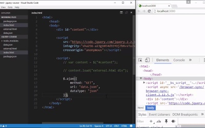 To say that AJAX is important to modern web development is to grossly understate AJAX's importance. Yes, it is extremely important but it also revolutionized and revitalized web application development. And whenever it was first stumbled upon, AJAX wasn't very easy to write. It required a lot of code and it was rather cumbersome as well, and that's one of the purposes of many of the JavaScript libraries that started popping up around the time that AJAX became popular. And of course jQuery is one of those libraries. It was created to solve a variety of problems, but one of those was to make AJAX easier, and jQuery has accomplished that. It has a variety of methods that you can use to make AJAX requests. So we're going to start with a method called load. It's purpose is to retrieve an external HTML file and load it into an element. So I have a file already. Is called a external.HTML and you can see what that content is. There's nothing really special about this file and inside of our index.HTML we're going to retrieve that external file. We're going to load it into this div element with an ID of content. So the first thing we need is to retrieve that element which I have already done and we will call content.load and then we specify the file that we want to retrieve. That is external.html. And whenever we save this on the right hand side, we're going to see the contents of that external file is now being loaded into our index. And if we inspect this, we are going to see that all of that HTML is there. We have the div with an ID of content and then inside, we have a p element. Now let's add something to this external file. We have a p element, let's also add a div element. And we'll say that this is the content in the div element. And whenever we load that document again we will once again see this new content. Now, if we wanted to just filter out everything except the p element. Whenever we call the load method, we can have our file name here and then follow that up with a space and then a selector. So we want to select only the p elements inside of our external file. So whenever we save this we are only going to see the contents of the p element. But if we also wanted to filter out everything but the div elements, we would reverse that and just specify div and then we see the contents of the div element. So that's the first method, it's very easy to do and it's very useful if you already have some HTML that you want to grab and then place inside of your document, this is the method to use. So the next method that we're going to look at is called AJAX and this is a method that we don't call on a jQuery object. In fact, we don't call the jQuery function at all. Now we still use it, but we use it like an object. So we have $. And then AJAX. And this AJAX method is the base AJAX method. Every AJAX method that is used in the jQuery library, ultimately calls this AJAX method. So, there are a couple of more that we are going to look at in this lesson. They are what are called shorthand versions of AJAX. Okay, so AJAX, we can supply a variety of different arguments, but one of the easiest is to just pass it in object. And this object has all of the settings that we want to use for this AJAX request. So the first would be the URL that we want to retrieve. Now, I already have a file called data.json. You can see that it has two properties and this is the file that we want to retrieve. But we also want to parse this into a JavaScript object and we will look at a couple of ways of doing that as well. So let's first of all specify our URL. So that is our first property URL, and that is going to be data.json. The second is going to be dataType. This is telling jQuery what we expect back from this request. And there are many options here. One is XML, one is text, but we want json. So this is what jQuery is going to do, it's going to make a request for data .json. It's going to get the response back and since we have said that we expect this to be json, it's going to automatically parse that json into a JavaScript object so we won't have to do that. So, we have URL, we have dataType, but we also need to set the type of request that this is going to be. So, that is with the method property, and this is going to be a GET request. Now, if there were any types of query parameters that we needed to include with the URL there is a data property. And we can provide a string that would have our query string, or we could provide a property. And it would parse that property into a query string. But we don't have to specify anything for this request. So we're going to leave the data method off. Now whenever I save this, this is going to go ahead and make the request for that file. Now, we're not going to see anything happen because we haven't told jQuery what to do whenever we get a response back. Now, AJAX requests are typically asynchronous. That basically means that we aren't going to get an immediate response from our request. So, for all intents and purposes, this is a deferred task. We are kicking off the task but we aren't going to get anything back immediately. So the Ajax method is going to return what's called a deferred object. This is something that represents a deferred task. So the deferred object has several methods to it. They are callback methods that will execute during certain times. Like for example, there is a method called fail. So if our request failed for some reason, then this fail method is going to execute. And we could pass in a function, that would have our request object. And this is the function that would execute when our request fails. But we're not expecting that to fail. Here let's just say something went wrong. Instead we want a method to execute whenever our task is done. And so that method is called done. And we do the same type of thing. We pass in a function and it's going to give us an object here because we have told it that we are accepting json back, so it's going to auto