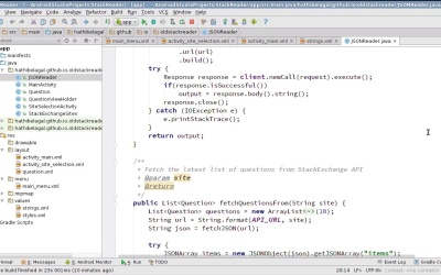 Hi in this lesson I'm going to give you a quick overview of the app we will be working on in this course. And then, I'll also walk you through the most important portions of its source code. So as you can see, we have one screen here that lists all the questions from Stack Overflow. It contains just one list view, and you can scroll to see more questions. This activity has an old fashioned menu containing two options. The Refresh option lets you refresh the list of questions, and the Sites option lets you pick a different Stack Exchange site. Let me click on Sites. It opens another screen containing a list of Stack Exchange sites. If you click on any site here, the app will load the questions from that site and display them. So, that's all there is to this app. It's a very simple app with just two screens. Let's take a look at its source code now. You can get it from this data repository. All you need to do is press this button here, and then click on Download ZIP. Alternatively, you can always download the course project of this course, and open the folder card lessonOne.2. Once you have the source code, you can directly open it using Android Studio. So, this is the home screen of the app, and it is created using the main activity class. Its layout is defined inside the activity main.xml file. This menu here is defined in a file called main_menu.xml. If you open it, you will be able to see the refresh and sites option defined inside it. The second screen of the app is created using the site selection activity class. Its layout is defined in activity_site_selection.xml. If you open the file, you will see that it contains just one list view. Let's go back to the home screen now. If you open the layout file of the home screen, you will again find just one list view inside it. So, now you know that both activities have very simple layouts. You might be wondering where the sites of site selection activity are defined. Well, they are defined as a string array inside strings.xml. If you want to support more Stack Exchange sites, feel free to add new items to this array. In addition to the two classes for the activities, this app has a few other classes. One such class is JSON reader. This is responsible for connecting to the Stock Exchange API servers, and fetching the questions from them. We won't be making any changes to this class in this course, so you can simply ignore it. Each question fetched from the Stack Exchange API is represented using this question class. As you can see, it has a lot of intuitively named member variables. Currently, the app is using only three of these variables, the title, the auto display name and the score. But, by the time we complete this course, we will have used almost all of these variables. Back in main activity, all the questions first from the Stack Exchange API are put inside this list called Questions. Now if you scroll down, you will see that the array adapter of the list view makes use of the list of questions. This array adapter follows the view holder pattern. That is the reason why this app has a QuestionViewHolder class as well. This class has just three text fields, one for the score, one for the title, and one for the author. The StackExchangeSites class is another class you can safely ignore. All it does is map the Stack Exchange sites titles to their subdomains. It has just one static map object and nothing else. Let us now take a look a few important methods defined inside the main activity class. RenderList is the method inside which the array adapter is initialized. In case of refresh, it also calls the notifyDataSetChanged method of the adapter. OnCreateOptionsMenu is the method inside which we are creating the menu of this activity. You can see that it is inflating the main_menu.xml file. The onOptionsItemSelected method is where the click handlers or the refresh and sites options are defined. For the Sites option, a new intent is being created for the site selection activity. For the Refresh option, a method called updateScreen is called, which first reloads questions from the Stack Exchange API servers, and then calls the renderList method. Lastly, whenever the user clicks on a question, a browser is opened where the answers to the question can be seen. So that code is returned here, inside the OnItemClickListener after List View. All it does is create a new intent with the ACTION_VIEW action, and pass the URL of the question to it. I hope you now understand how this app works. There's really nothing complex about it. If you've created Android apps earlier, I'm sure you didn't find anything confusing here. In any case, you don't have to worry too much about its functionality, because in this course we will be focusing more on the looks of this app. In the next lesson, we'll start configuring this app to support material design. Thanks for watching.