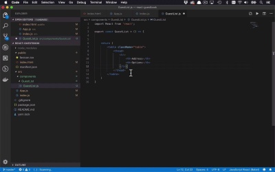 Now we're gonna start to build out a little bit of the different parts of our application. So, as you can see right now, we have the ability to or at least the area where we can add a sign in portion of our guest book and then we can come over to guests and we can see a list of our guests. So let's start to build out the list portion first. Because there's a few less moving parts than there are in the sign in section. So we'll come back over here to our code. And let's go ahead and start by creating a new component. That can be the actual guest list piece itself. So I'm gonna come into my Components folder and I'm going to create a new folder. And we're gonna call this guest list. And within here we're going to create a new file. We'll call this guestList.js. And the first thing that we wanna do when we're creating these components is we're going to import React from React. And the first thing that we're gonna do when we create these components is we're simply going to say import. React from react. And then we're gonna create the basic shell of our component. Now remember, I like to do a functional component and I'd like to export it explicitly. So I'm gonna say export const and we're gonna call this GuestList. We're gonna set that equal to nothing yet, no input parameters just yet. And then we'll give it a body here, which is gonna have nothing yet, except for a return statement inside of our parentheses. And that's just the basic syntax that we're gonna use to return that JSX that we were talking about before. And now let's go ahead and build this out a little bit, so we can at least see what this list is going to look like. We're gonna keep it fairly simple. We're gonna create this as a table element, which is going to have a table class attached to it, and we're going to define a table head, and within here we're going to define a single row. And we're gonna have two columns in here. So we're gonna have our first one, which is gonna be address. And then after that, we're going to create one more that's gonna be options. So basically what we wanna allow is we wanna allow to see the user that has signed in and the information and then we wanna give some options. We can either edit it if we made a mistake, or if that person made a mistake, or we can delete it or whatever. And that will kind of give us a little bit of functionality that we can begin to play with. So, that's gonna be it for head, now we'll define the body. And within the body this is going to evolve a little bit over time, but we can give it a little bit of, actually for now, I think all we're gonna do is we're gonna create a single table row and we're just gonna say No guests, because we really don't have anything to put in there yet, but we'll get there. So if we go ahead and save that now we have a new guest list component that we want to be able to use within our application. So if I come over into app, now I want to be able to put this down here under my guests, and it's actually quite simple to do that The first thing that we're going to do is we're going to import that component. So I'm going to import, but remember I need to use these curly braces, I wanna import guest list and I want to bring that in from, so let's take a look at where we are. We are in App.js. I wanna go into my GuestList directory and get this GuestList component. So I can say ./, I wanna go into components, and I wanna go get my GuestList. So now I have my GuestList component and how do I use that within a another component like in here? Well, all I need to do is come into wherever I wanna use it. And I use it as an element, so I can say I want to now display here, my guest list. Now, there's nothing to pass into this. We'll get into that in a little bit. But there's really nothing else to do here. So I can go ahead and save that. And if I come back over to my application, you're gonna see that we have a little bit of a problem here again, module not found, cannot resolve guest list from components. And the reason for that is because I have to go one layer deeper, just like that. So I'll go ahead and save that. We'll come back. And now you can see here that we now see that component being rendered. So we have address options, and we show here no guests. So now we have the ability to create sub components and kind of put these things all together and display them. Which is great, which is fairly simplistic, and we've kinda touched on that in my previous course. And we want to be able to continue to do the same things that we used to do, like passing properties into components and displaying things dynamically, and things like that. And we'll get to all of those things. But now I want to start to cheat a little bit and show you how we can get some data to actually show up in here. And not just be this no guests. So in the next lesson I'm going to begin to create a little bit of a list or at least a starter list that we can start to begin to show data, and display it on the screen.