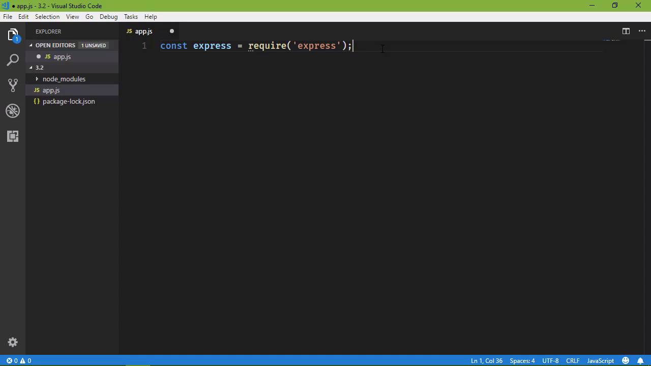 In the previous lesson when I said your code editor is your most important tool, that is absolutely true until you start talking about npm. Because npm is, I have a hard time defining npm because it has hundreds of thousands of packages. These packages can be used within your projects. They can be used to make your projects easier to work with. They can be used in completely different projects for completely different platforms. This is the dependency management tool that every web developer, and in many other cases desktop developers, will use to manage dependencies. It's just become that thing. So the big problem then is finding the packages that you want to use because there's so many available. And especially there are so many that try to solve the same thing, so it's hard finding the one that you actually want to use. Like for example, every platform has the framework. PHP has Laravel. Yes, there's other frameworks, but Laravel is the framework for PHP. For ASP.NET, it is the MVC framework. For Ruby, it's Rails and so on and so forth. Well, with Node, it used to be that way. That we could say that, hey, there is a framework that you should use for your web apps be it a true web application or something to provide services, so web services. And that would be Express. But that's not necessarily the case now because there are other options. However, Express is the one that is still the most used. So that's what we are primarily going to talk about in this lesson. We're not going to cover Express in any amount of detail because it requires its whole other course. But when it comes to writing a web application, Express is a good place to start because it gives you all the tools that you need to build whatever web application that you want. So the hardest part is finding your package that you want to use. And by doing a search for framework, we can see Express here. So let's go and look at Express. And we want to install this, so that we can use it within our project. Now over in the right-hand side, we can see the install command, npm i express. I don't see people use that. What people typically use is this npm install. Now the i is the same thing. It's going to install Express. But whenever we type it, we typically just type out install. Don't ask me why, that's just what we do. So let's go to the command line, and let's create our project. This is 3.2, which apparently already exists. So let's do a quick check. There's nothing in there, okay. So we are going to install it with npm install express. So any package that you want to install, that's how you do it. The hard part is knowing the name of the package that you want to install. But for your projects there are going to be some dependencies that you're just going to start off with. And so it's easy to actually do that. So we're going to install it. It's not going to take very long. And then we're going to fire up our code editor. Now after you install a single package, you're going to see a new folder called node_modules. This is where all of the things that you install from npm go. So if we drill down, we're going to see a lot [LAUGH] of things here. We just installed one package, but Express has many dependencies. So everything that we see here is a dependency of Express. And the more packages you install, the more folders that you're going to get. In fact, Node modules can get pretty darn big. There are many jokes as to the size and weight of Node modules. And it gets to the point that you definitely don't want to be transmitting all of those modules over the network because there's just a lot of them. So when it comes to the point to where you want to commit your project to source control, or move it onto a network share, or whatever you want to do, there are ways to make it easier to transmit your project. And we will look at that here in a few moments. So let's create a new file. And we're gonna call it app.js. And the first thing we're going to do is pull in Express. So we are going to say require('express'). Now we don't have to specify the path or anything like that because this is a named package. So whenever you use the require function, and you are requiring a named package, it's going to, first of all, look to see if there is a native module with that name. And so a native module would be like fs, or util, or things like that. But Express is not native, so it's not going to find one. So it's going to look in the other places, and one of those is node_modules. So it's going to find it there, and it's going to load it. So at this point in time, we have an Express function that we can use to essentially initialize our applications. So what we'll do is store that in a variable called app. And then we will define what are called routes. A route is where we define a URL, and then we define a callback function that is going to essentially handle the request for that URL. So if we make a request for the route of our application, then this callback function is going to execute. And in this case, we're just going to use the response that has a send method and we'll say, Hello, Express! So nothing difficult there. And then we need to listen on a particular port, so we will specify 8080, or we could choose whatever we wanted. 8080 is what I typically go for. And let's also have a message that says, Listening, just so that we know that the application is running. So there we go. We have our application. Now in just a few lines of code, we have a completely working HTTP server that is [LAUGH] so much better than the one we wrote a few lessons ago. But that goes without saying because this is a package that has been used and developed for many years. So let's run this. We'll say node and app.js. You see that it's listening, so we can hop on over to the browser. And we'll go to local host at 8080, and we will see, Hello, Express! Hooray, we have a working application. Now when it comes to defining a route, you can hard code a route jus