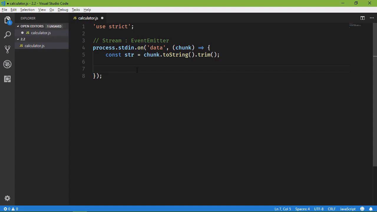 In the previous lesson we run an application that watches for changes to a file, and then writes a message to the console whenever changes are made. And it demonstrates, well, primarily two things, the first is the event loop and how Node achieves a synchronous execution. The second thing was kind of events, now I say kind of because we used the watch method on the file system object. And we passed in the name of the file that we wanted to watch, and then we passed in a function to execute wherever changes were made. So this function that we wrote is definitely an event handler, there's no doubt about it. However, there are certain patterns that you're going to see when it comes to event handlers. And while there are exceptions, and in this case the watch method is an exception, the two arguments that are passed to the event, and there are the event type and the file name which is useful for watching. But when it comes to just regular, everyday event handlers that's nothing like what you would normally see, so. What I want to do in this lesson is expose you to several different things, the first is going to be just standard event handlers. And this is important because it's a pattern that you're going to see just everywhere, both throughout the Node API as well a third party APIs as well. And the second thing are streams because we are going to use streams a lot in all of our applications, a stream is just a representation of data. So it could be data coming from the user, from the command line, or it could be data coming from an HTTP request, or an HTTP response, or it could be from reading a file on the file system, just any type of input or output can be a stream. So what we are going to do is write an application so that the user can type in an arithmetic operation in the command line, and then we will evaluate that and give them the value. I was not expecting that, we get that functionality by default, I bet that's PowerShell. If you'll indulge me for just a moment, I want to test, yeah, it's just PowerShell, okay, I did not know that, I learned something new. Okay, so let's make our directory this is 2.2, so let's do that, let's fire up code, and we will create our file, I'm just going to call it calculator.js. Let's use strict, and then we need to access what's called the standard input stream, stdin. If you've done any C or C++ programming then you've seen stdio, standard input output, in this case we just want standard in. So we can get the standard input in a variety of different ways. I am going to use what I think is the easiest and that is through an object called process. This is the process Well of our application whenever we run it that is the process that is running. So you can think of process kind of like if you've done any client side development like Window or document or things like that that are just automatically available to us, process is one of those things. It has a property called STDI in standard input, so this is a string, standard input, so let's do this. First if all we have a stream, and stream inherits from event emitter. Now if you remember from the previous as now very briefly mentioned event emitter. Event emitter is what is going to give us a method called ON. So that's, we can listen for a particular event, so, ON, whatever event we want to listen to, we will execute our function. It's the same idea behind special events if you used jQuery before. Now in the case of stdin, what we want to listen for Is an event called data. Whenever the user types something into the command line, that is going to fire the data event. So whenever the data event occurs, we want to get whenever data that they entered into the command line. So, that is going to be passed as an argument to our function. I'm going to call it chunk, because that is, primarily, what is used in the node documentation. Any time that you're working with data like this, especially from the STDI in stream, then it's simply chunk. Now chunk, in this case, is an object, so what we want to do is convert it to a string, but it contains every thing that the user typed in. So it's whatever alpha numeric characters as well as the carriage return. So basically we want to trim all of the pre and post white space, so let's do this, we'll see const str = chunk we'll convert it to a string then we will call the trim method. So that's going to give us just what the user typed, or at least what we want. Now, as we experienced in the previous lesson, our application is going to run, and it's going to run until we tell it to stop. Because it's going to have something to do in this case, it's not just outputting something and then finishing. It's going to be waiting for the data event to occur, before it does anything. So, we could add in a check to see if the user typed in exit, then we want to exit our process and we do that by saying process.exit, and then we can pass in the exit code which in most cases is just going to be 0. If we had some kind of error or if there was some other state that we were exiting in. Then we could specify whatever code that we wanted to signify whatever state that it is, but since this is a clean exit typically that is represented as a 0, so that's what we're going to go with here. So the next thing we need to do, is then evaluate whatever the user types, so let's create another variable, we'll just call it value, and we will eval that user input. Now of course, this is not something that we want to do, I'm doing this strictly for demonstrative purposes, so please do not do this in any production code. So we are going to evaluate what the user typed in, and then we are simply going to log that result to the console. So, we can say result and then we will have in the value. That way, especially in my case, we can make sure that we are seeing the result from Node as opposed to the PowerShell. So that will give us the result, and then that will work, so we could write an initial mes