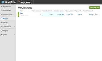 Sign in to your New Relic account and select the Mobile tab on the left to see a list of the mobile applications New Relic is monitoring for you. This list immediately gives you an idea of the status of your application by showing you the number of active sessions, network performance, and possible problems New Relic has detected. Click Rain to further explore the data New Relic is collecting for us.