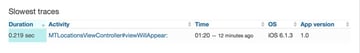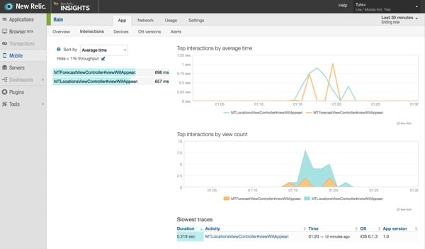 Even though network performance is important for most mobile applications, the performance data New Relic collects isn't limited to that. If you open the Interactions tab at the top, you'll see how long certain interactions take and, more importantly, New Relic conveniently shows you which interactions are slowest.