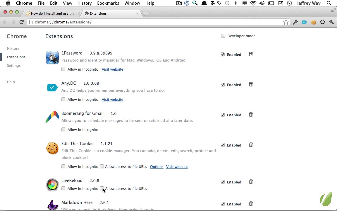In this video, I'll show you how to work with the LiveReload plugin for Sublime Text 2. As always, the first thing that we need to do is install the plugin. We can do that through package control. Install, LiveReload. Great, now that's installed, but for this particular plugin, we need one more thing. We need to install the necessary browser extension. If we come back to the live reload repo on GitHub, we can see links to the necessary extensions. In this case, I'm using Google Chrome, so I will click right here. Here we are. As I'm using Chrome, I wanna download this, but one quick note. Let's go ahead and download it. But you can see here also in Chrome version 21 or higher, and I happen to have version 21, we need to manually drag in the extension. Now, we can access all of our extensions by going to Window Extensions. I'll move this to the side and now I'm going to manually drag the extension in like so. We'll click Add. There we go. And now we can see LiveReload version two has been added, and I'm also going to make sure that I enable Allow access to file URLs. Great, so now let's test this out. Here, I don't have anything to work with, so let's use the Fetch plugin, which we covered already. To pull in the latest version of Boilerplate. Now I will switch to index.html and let's open this in the browser. I will move this to the side, and my code editor to the right. And now I'm going to turn on Live Reload. You'll know it's on because you'll see this little compass in the middle. Now let's test it out. I will scroll down, and let's remove this second sentence right here, and if I click Save, you'll see that it instantly updates. Hi there, save, how are you, save. Excellent. Let's see if it works with CSS as well. I will open up main.css, let's remove everything, Save. And we'll set the body background to red, color to green and now we have a beautiful website that I hope you never share with anybody. But this is cool. Now we have live reload functionality with Sublime Text 2 and it only took us about 45 seconds to set up.