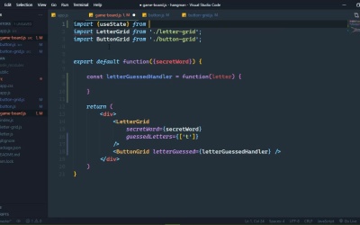 In the previous lesson, we started implementing the functionality for our buttons, so that whenever we click on them, they are tracking their own state and they hide themselves. But they need to do more than just that. They need to notify the application that the user clicked on a button that represents the letter so that the application can do something with that letter. So then the question becomes how do we do that? Because if you've noticed, data tends to flow from parents to child. For example, inside of app, this is where we are using the game board component, and inside of app the secret word is originated. This value TutsPlus originates here inside of the app component and it's being passed down to the game board through the secret word, prop. Well, if we look at the game board, we see the same pattern to where the secret word is then flowing down into one of its children, the LetterGrid using the secret word prop. So the flow of data goes from parent to child, and there's not a built in mechanism that allows the opposite for a child to pass data to the parent. There are however programming patterns that we can use, very common programming patterns that we can use to facilitate the child to parent communication. And we have already done so. We did so in the previous lesson within our own button component. Because remember that what looks like HTML is still just a React component. So this HTML button has a prop called onClick. And then whatever data the HTML button needs to supply to our button component, it will pass that as an argument, which in this particular case is just any event object. So we can take that same methodology and apply it to our own custom components. Like for example, we can add an onClick event handler for our button component because all this onClick is as far as a React component is concerned is a prop. So we can go to the ButtonGrid. And we can say that we want to handle this onClick event and we would do so using a clickHandler. So of course, we would have a function called clickHandler that would then execute when this button is clicked. And the way that we would wire that up inside of our button component is like this. It's a prop, so we are going to, first of all, destructure that from the props so that we have easy access to it. And then inside of this clickHandler, we are going to call onClick, and then we will pass in the value, the letter that this button is supposed to represent. So this means that whatever is handling our onClick event will then have that letter to work with. But then the problem is that the ButtonGrid itself doesn't necessarily need to know what letter was clicked. Because as far as the functionality of this component is concerned, we are essentially done. What does need to know, is the game board, because it needs to modify this array called guessedLetters so that the LetterGrid could handle that. So what this means is that our ButtonGrid could have its own kind of event like guessedLetters or let's call it letterGuessed. And we would, of course, set this to a function, but for right now this ButtonGrid has a prop called letterGuessed. So we could define that in our props here. We will destructure that, and then we could pass that on to our button component as the handler for the click event. So in this case, whenever we click on our button, it's going to trigger this onClick, which is going to call whatever was passed to the ButtonGrid from the game board. And so let's define a function. We'll just call it letterGuessedHandler. So let's define this function. We're going to have the letter to work with, but then we need to add it to this array that's being passed to the guesedLetters for the LetterGrid. Well, this would be another opportunity to useState. This array that we are using needs to be updated every time a letter is guessed. So this game board needs to track its own state to do that. So let's add the import statement for useState. And then we will create some stateful variables that we can use to track this information. Like for example, we can call this guessedLetters. And then we will have the function that we would use to update this value, so we would call that setGuessedLetters. And since this is an array, we will initialize it as an empty array whenever we call useState. And then inside of our letterGuessedHandler, the first thing we want to do is take the letter and convert it to lowercase. Because, remember, we want to normalize the string so that we don't have to worry about uppercase and lowercase characters. So we will have our lowercase character and then we will add that to our guessedLetters, that is our state. So we would call setGuessedLetters, and then we would supply the new value for the array that contains our guessed letters. But the issue here is array is a very special type of value, it's more than just a string or a Boolean. So, what we need to do is pass a function to setGuessedLetters, which is going to execute, and this function will then update the value that will then be set to guessedLetters. And this is gonna look a little funky, but this is how we do it. We're going to create a new array, and we're going to spread out the current array, which is represented by this previous value as the parameter. Then we will include as the next element in the array, the lowercase letter that was given to us, and that is going to update the guessedLetters with a new value. You might think that we could do this a lot easier by just saying guessedLetters, we could push in that new value, and then we could call setGuessedLetters and pass in guessedLetters,. Unfortunately no, we can't do that. That's not going to tell React that the value has changed which will then cause React to redraw the appropriate components. This is the only way that we can get around this. So let's very briefly go over this once again. We have wired up our own custom click event for our button component that will be called when th