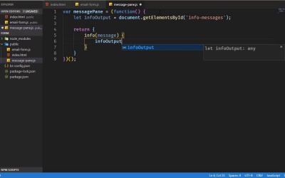 In the previous lesson, we changed our markup so that we have essentially 2 columns. On the left hand side we have our form, which leaves us this area on the right for displaying messages. And the great thing is we have a variety of different types of messages to display. We can have informational like whenever the user focuses on any one of these fields. We can have some informational messages. And if validation failed for any one of these fields, we can display the validation errors. We can even have our application errors, over on the right hand side as well. Because there's no guarantee that whenever we click on the submit button, that the HTTP request will actually succeed, it could fail, but we could also display a success message. So, this gives us a lot of options to enhance the user experience. And in terms of code, I am thinking, that we need some way to display these different types of messages. So I want to create a separate object one that's going to represent this message pane, if you will. And this message pane will have multiple methods for the different types of messages because who knows we might want to display those messages in a slightly different way. So let's start by creating a new file. Now I want to put this inside of a new file because while it could be considered that this is part of the email form I'm thinking of this as being a completely separate entity. This is a message pane. And plus I don't want to clutter up our email form file. So let's create a new file. Let's call it message pane. And let's go ahead and include this inside of our HTML. Now since this is essentially a dependency for our email form, we should list this before the email form. So we will have message pane listed first. And then we will have our email form. And this is going to allow us to have an object that we can then pass to this immediately invoked function. So, let's say that we're going to have this global variable called messagePane. And then inside of this immediately invoked function we can actually refer to that much shorter like msg, so that whenever we focus any one of these form fields, we can say msg. And then, you now call an info method, and then pass in the message that we wants to display. So let's implement that. Let's get to our message pane. We will start with our variable and we will use an immediately invoked function. Just like we did before, but this is going to return an object. And since we already know that we need an info method, we'll just have our info message. And then we will have the code that's going to actually run write that message to our messagePane. And so we need an element that's going to be used for displaying those messages. So let's go to this second column. And let's add a div element that has an id of info-messages. So the idea is that this is where we are going to put all of our informational messages. And so instead of our email form or not our email form instead of our messagePane, we are going to retrieve that element. Let's call it infoOutput. And we will use getElementby id in order to retrieve that element. And then for right now, let's just use inner html. And, because that's the easiest thing to do, and only does that replace whatever was currently inside of the elements but it also gives us the ability to set, the new content there. So and now, whenever we focus on any one of these fields we should see a message pop up. Let's do a refresh here. And we're not seeing anything. Let's make sure that code is saved. It is so what's the big deal? Let's take a look at a console. Let's see if we are getting any errors and we are. GetElementsById. That is not a valid method, so there we go, that should fix that and whenever we focus there, we can see our message. I don't want that all the way at the top, though, so let's add some style here. If we're going to do this correctly, then we of course would want to put this inside of a class or something to set these styles and then apply that class here. But I'm just going to take the easy way out. Let's add some padding to the top. And actually, let's just add some padding all the way around. And let's do five pixels. We'll see what that looks like. So that's whenever we focus here, and that's a little bit better, and we can go with that. All right, so now we just need to be able to display different messages for these fields. And one of the easiest things to do is to just include that here with our markup, because we have the ability to use custom attributes that begin with data. So we can say data-info that will be for our info messages and we could have something generic like, Please into your name, but lets do something a little more fun like, Who are you. And then for the email address, I don't know we could do something like, the better to respond to you with. That's at least a little bit more creative. And then for the message, what can we do there?. I guess we could just say something like what's on your mind or something along those lines. So that this is the information that we will grab inside of our input event listener and then we will pass that on to our message pane object. So we already have that code boiler plated out we just need to retrieve our message. And that's going to be very easy because we have the targets of the event which is the actual field that we are focusing on. And then we can use the getAttributes data-message or no, data info. In this particular case, that's going to grab that value, and then that's going to pass that on to our message pane so that we will see our messages being displayed? Now we are handling the blur event as well. And while we technically don't need to because we can see that this works just fine. Whenever we blur out of one of these fields We still see the last message that was written to our message pane. And I don't want that. I want that to clear out because that could be a little confusing for the end user. So for the blur event, we wi