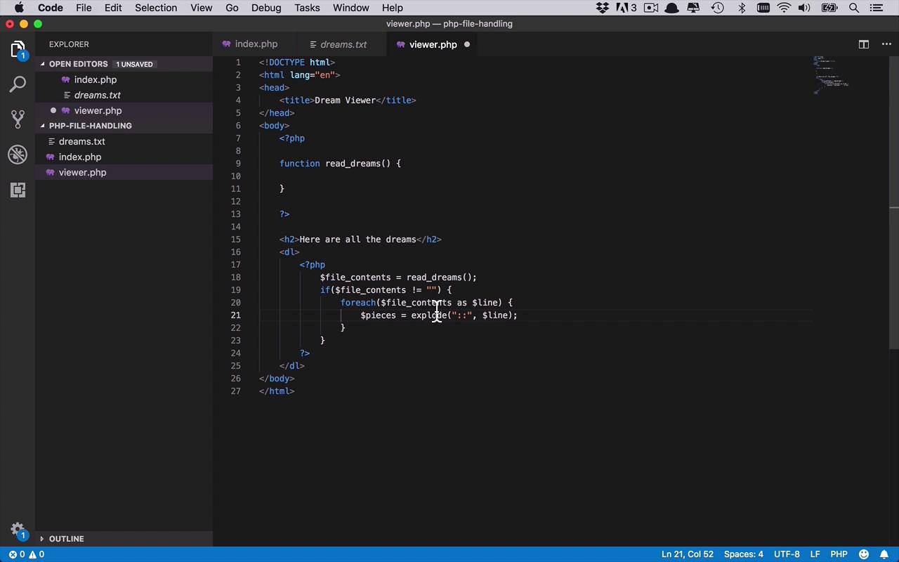 Let's talk a little bit about how we want to display this data. So we did kind of mention a little bit about creating a definition list and having some PHP in here and calling our function, but let's kind of design how we want this to work. So really the easiest thing for us to be able to do at this point, would be able to call our function and get back an array of combinations of our name and our dreams. So I would really want for each line that shows up in my file, I wanna get that number of lines back in an array, so that I could just kind of loop through all of them and display them here to the end users. So without actually writing the read_dreams yet, let's go ahead and see what something like that might look like. So what I would like to do is get the contents of the file, so I'd like to say file contents, and read_dreams. So now I have an array of the combination of the name and the dream in file contents. And now I wanna be able to display that. So the first thing that we're gonna do is we have to always remember to write code defensively. So what happens if there's no file or it's empty and we just get back something like an empty string. So let's go ahead and check for that first. We'll say if the file contents is not equal to the empty string which means there's something actually there, then we wanna to look through some stuff. So we'll say for each file contents as you can call this anything you want. We'll call it maybe line for each line. Then we're gonna want to get that data and split it apart. Remember we created this little demarker in the middle here of the double colon. So now we know how to split that. So let's go ahead and say pieces or you can call this anything that you want. Pieces is gonna be equal to. We're gonna use the explode function which takes a string and you say what you want is use as your delimiter. In our case, it's gonna be that double colon and what you wanna pass in which is gonna to be our line. And what's gonna happen is explode is gonna return an array of all of the individual pieces that are broken up if we were to remove this delimiter. So now I have two pieces in here, we can make that assumption. You could obviously write some code in here to double check that, but we're gonna make the assumption that that works properly. And then we'll do a couple echo lines. We'll say echo. We'll say the definition term is going to be the first part of that pieces at the index zero. And then we'll create the closing tag. And then we'll need to do the actual definition. And that's gonna be the second item that was in the pieces array right there as well. And we'll close that out, definition, there we go. And we'll go ahead and save it, now what happens if there's nothing there though? That's the other thing we wanna be able to take care of. And actually right now because we don't have any logic yet, we're gonna work on that in the next lesson. Let's just go ahead and return the empty string for now. But what happens if it is the empty string? Well, let's put a little else block in here, and we'll simply echo an h3 here, and we'll say, no dreams yet. So that at least we can see if we got something or if there's nothing there or whatever. So now let's go ahead to save that. So as you can see, we wanna get the dreams, we want to see if there's anything in there, if there is something in there we wanna loop through them, we want to explode each line on our delimiter. And then echo out the term and the definition being the person's name and their dream and we'll just loop through all of those. But if there's nothing there before we get the empty string which is all we're doing right now, then we just want to say there's no dreams yet. All right, so let's go back over to our page here and go ahead and refresh. And as you can see we have no dreams yet. So now we're to the point where we're ready to start reading some data from the file, and just like anything else, there's several different ways you can do that. So over the next couple of lessons, I'm going to show you the basic fundamental operations that go into reading a file using PHP and then once again we'll use a couple shortcuts that are there but only after we fully understand what is a shortcut for.