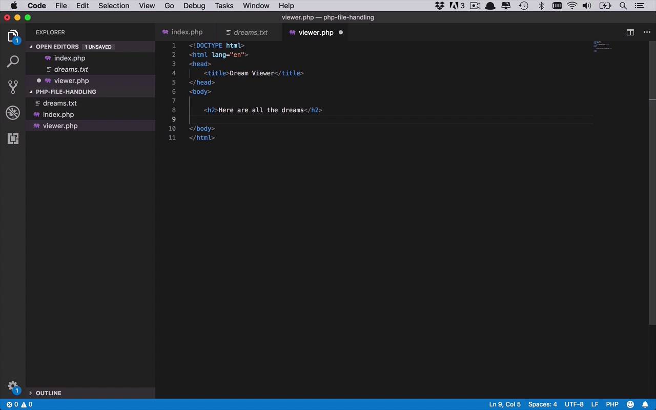 Now that we're actually able to successfully write the dreams to a file, let's start to build out the infrastructure to allow us to actually read these dreams and display them on a page. So the first thing that we wanna do is create a new page. So we're gonna create a New File, and let's call this one viewer.php. And then once again in here, we're gonna have an html file. We're gonna use html:5 again. And once again, we don't need all of this extra stuff in the header, but we'll give the title. We'll call this one the Dream Viewer. And what we wanna do in this case? Well, we wanna do some similar things that we did the actual index.php page. We wanna be able to have a function that's gonna handle the reading of the data from the file, and then actually displaying it. So lets kinda put those two things together here. So lets add another h2 and you could do this in PHP, or you could do it in straight html. I'm gonna do it in html, and we'll simply say here, Here are all the dreams. Then underneath it we're gonna create a list of combinations of the names and the dreams, and we'll just do that with a dl. Will do that with a definition list here Where we'll have terms and definitions, and we'll wind up filling this out with some stuff that we get from PHP. So we're gonna just put our PHP block in here, and we'll wind up calling something and doing something in here. And what do we wanna call? We wanna be able to call a function that's gonna be able to handle this reading for us. So we'll call read_dreams. and we don't have to pass anything in, and then we'll have to fill that out, right? We wanna be able to fill that out but in order for this to work we're gonna have to wrap this in a PHP tag just like that. So now we have our read_dreams function, and we are going to use that read_dreams function down here in our actual codes. Let's go ahead and save this. So what's gonna wind up happening is we'll have to go to the viewer.php. And then we'll see a list of all of the names and definitions, where all the names and dreams of people right here. So now we have the basic layout of what our code is gonna be. So over the next couple of lessons, we're gonna start to fill this out and see how we're gonna read the dreams. And ultimately, how we're gonna display them to the end user.