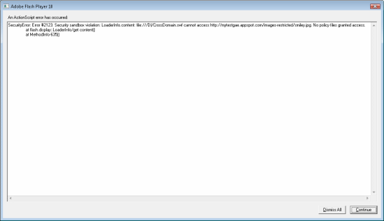 However, access to the smiley face image in the /images-restricted/ directory is not permitted because there is no crossdomain.xml file in the images-restricted directory to override the (lack of) access granted by the crossdomain.xml file in the root of the domain. Running the code below will result in an exception being thrown: