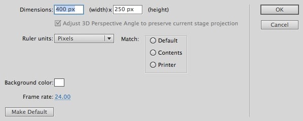 Launch Flash and create a new Flash Document, set the stage size to 400x250px and the frame rate to 24fps.