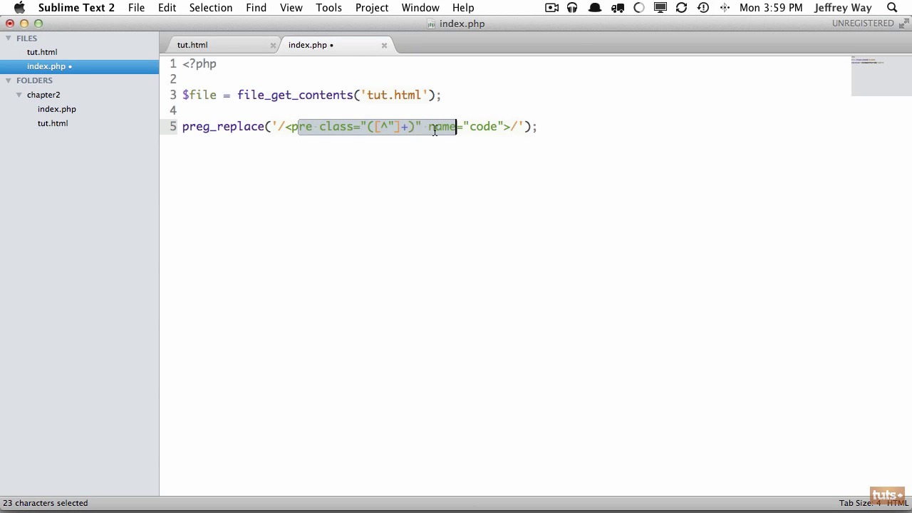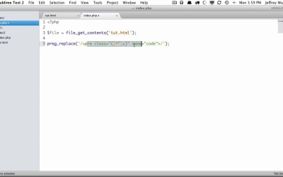 In this lesson we'll load our text into a variable within PHP. We'll learn how to use preg_replace() function along with our regular expression to find and replace the code tags within our file. There are several preg_replace functions available to you which can be found in the documentation.