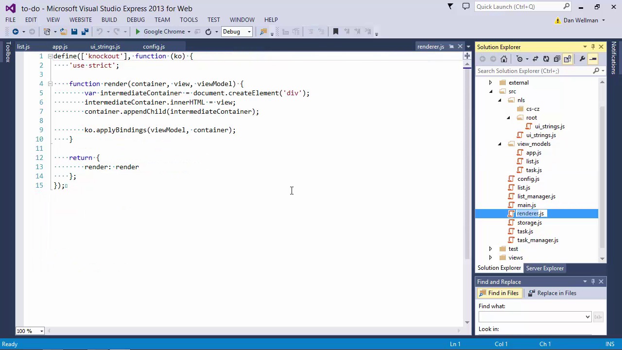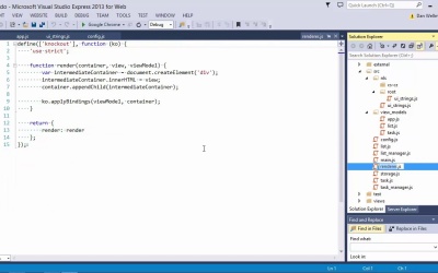 Hi folks. In this lesson we're gonna see how we can easily internationalize our simple app using another of Require's official plugins, the I18N plugin. It works in a similar way to the text plugin that we looked at earlier, in that the plugin will be automatically loaded by Require whenever we prefix the path to the module that we want to load with a special identifier. So first of all, let's download the plugin to our external directory. We can also get this file from GitHub. [BLANK AUDIO] So first of all, let's add a new path to this module in our config. [BLANK AUDIO] So the I18N plugin is used to load different language modules based on the browser's language and locale settings. We've already got a module which contains all of the strings that are displayed in the app's UI. So this can serve as the default or root language module. We just need to make a couple of changes to our app's folder structure. The I18N plugin expects all language modules to be within a directory called nls. So first of all, let's create this new folder inside the SRC folder. [BLANK_AUDIO] Inside this we should create another folder called root. We can then move our ui_strings file into the new root folder. [BLANK_AUDIO] So now we need to add a new module to the nls folder which configures the app's language supports. So let's create a new file directly in the nls folder called ui_strings. Inside it, we can add the following code. So this tells the I18N plugin that we want to load the root module which is our original ui_strings module. Now there's a couple of different places where the ui strings module is used, namely our view modules so we just need to update the paths in these modules. In both places we should update the path in the dependency array to use the I18N plugin. So now, if we run the page in a browser once again. We should find that everything is exactly the same as it was before. Which at this stage is good. The difference is that we're loading the new ui_strings module. Which is then loading the root language module. Which is our original UI underscore strings module. The great thing now though is that we're almost completely set up to support any other language or locale that we want. So let's say we want to support Czech in our app. First of all we need to create a new folder in the nls folder called CS hyphen CZ. [BLANK_AUDIO] So we can now add another ui strings module to this folder which contains the translated strings that we want to display. So I've already got this file set up. Here are the strings in Czech form. So now I'm just gonna copy this into the new folder that we just created. So now we just need to signal to the I18N plugin that we want to support Czech. So we do this in the module in the top level nls folder. That's it. We're done. Our app is now internationalized to the Czech language. So to test this is working, I found it's easier to switch to IE briefly, and we just need to make some changes to the region settings in the control panel [BLANK_AUDIO] So I've just set the format and location to Czech Republic. [BLANK_AUDIO] And now let's load our app in IE. [BLANK_AUDIO] And as you can see, it's automatically detected the browser's locale settings. And our app has automatically localized the visible strings to those found in the Czech language file. [BLANK_AUDIO] Okay, great. So our test app is starting to get the functionality that it needs, but there's still a lot of work to do. So let's wire up the add task button so that we can actually add tasks to our lists. The functionality for this can go into the list view model, because it's a part of the list ui. So first of all, we just need to make a minor modification to the renderer, because all of our tasks are being rendered to the same container. So let's just update the render method so that it takes a fourth parameter. And we'll call that parameter, use child. It will be a bouillon. So when this parameter is true, we want to apply the bindings to the intermediate container instead of the container. Otherwise we won't be able to add more than one task. [BLANK_AUDIO] Great, okay. So now in the list view model, we'll need to require in the task manager, renderer, and task view model modules, as well as the task.html view. [BLANK_AUDIO] And now we can add the following function to the List View model. [BLANK_AUDIO] So the new method that we've added is quite simple and differs from the method to create a new list only very slightly. We create a new task, select the list from the page, and create a new task view model. Which we then set some properties on, including an ID, which matches the task position in the tasks array. So lastly we just need to pass the container, the task view, and the task view model, along with true for the new fourth parameter to the renderer. And then we can remove the task name from the input, and lastly we just need to return the task view model that gets created. So we can use the same bind trick to create the handler function to set to this object for the main add task method that we just added. And now let's update the task view model. So we'll want to use knockout inside this module as well. [BLANK_AUDIO] And now we just need to add the bindings to the task view. [BLANK_AUDIO] And don't forget we'll also need to bind to the add task handler method from the list view. And let's just go back to the browser now and check that everything is working as it should do. [BLANK_AUDIO] So it looks like the task name is not being added correctly. Let's see if there's any errors in the console first of all. There's nothing going on in the console, okay. [BLANK_AUDIO] And our task model just needs to accept the name of the task. [BLANK_AUDIO] It's interesting that that's not working. Let's go back to the code and we probably need to get rid of the task name after we've actually rendered it. [BLANK_AUDIO] That's better. So in this lesson we saw how easy it is to provide simple language modules that conta