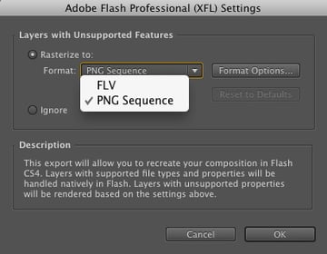 - Rasterize to: You need to decided whether the output will be rasterized to a series of PNG images or an FLV. The PNG choice may strike many of you as being one to be avoided at all costs. Exporting a series of images and then sticking them in the Flash movie is, to say the least, a tad heretical. Not quite. If you select this option, frames that are identical and adjacent to each other are rasterized only once to a single PNG. That PNG is then referenced several times in the XFL document. Use the FLV option if a layer contains video. Clicking the Format Options button launches the FLV/F4V export settings.