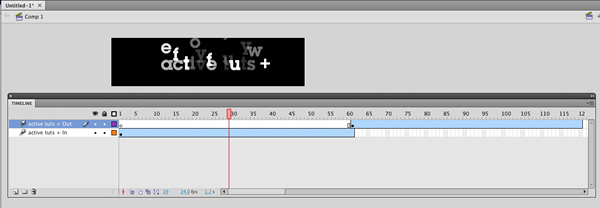 I have used this effect in a couple of XFL demos I have done, not because I am lazy but because the focus here is technique not design. In this case notice the two layers named active tuts + In and active tuts + Out. The other feature to be aware of is that the Comp i’s dimensions are 400 X 100 and the frame rate is 24 frames per second.