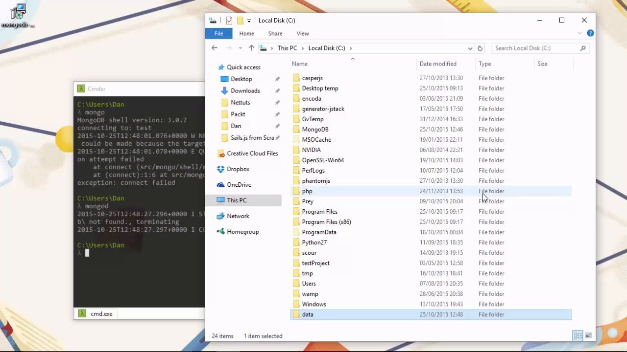 Hi folks. In this lesson we're going to install and configure MongoDB, a popular document based database alternative to traditional relational databases like SQL. We've already got the rest of the MEAN stack. Express, which is one of the foundations upon which Sails is built. Angular, which we saw when we put the front end together. And Node of course, because without that, we'd be right back at the start of the course. So let's download Mongo, the M in MEAN, to complete the setup. We can get it from MongoDB.org and there's a big green button there, Download MongoDB. Let's hit that. And it we scroll down slightly, we can see that there are various platforms that are supported. There's Windows, Linux, Mac, OS X and Solaris. So, download either the installer or the package for whichever platform you're using. I've already got a copy downloaded and on my desktop ready, so I'm gonna run that now. So on Windows, there's one thing that we should do during the install process and that's make sure that Mongo gets installed to a location that doesn't have spaces in the path. By default, it gets installed to Program Files, which does have a space in it, so we need to click the Custom button in the Installer. So then we can click Browse and we can see path that it wants to install to but we'll need to change that. And instead we'll just go to the routes of C and we'll stick it there instead. And we can choose the same path that it wanted to install to previously. It's just going to the root of C instead of in Program Files. So we'll wait for that to install. It shouldn't take too long. And once that's installed we should probably add Mongo to our path so that we can run Mongo commands from anywhere on our system. So on Windows we can do this by going to the Control Panel. And then we want to go into System. And then we can hit the Advanced System Settings option at the left here. And Environment Variables. Then we want to find the path system variable, We need to make sure that we end any previous entries with a semi colon and then we can add the path that we just installed Mongo to but it needs to go to the bin folder. So once that's done, we should then be able to run Mongo commands from anywhere on our system. Let's give that a try. So the mongo shell startup, and it tells us the version and that is trying to connect to the test db. And we then get a message to say that it failed to connect. And the reason why it failed to connect is because the mongo server Is not actually running, so to stop the mongo server, we need to use the mongod or the mongod command instead and there's a little bit of set up that we need to do. As you can see, it's looking for a data directory at the root of the C drive, so let's just go and create that now. And that needs to be called data. Inside this folder we need to create another new folder called db, and this is where Mongo stores all its data. Okay, great. So now we should be able to start the server. And it's started and there's a message at the bottom saying that it's waiting for connections on the default port of 27017. So now we can open up another Command line. And this time we can run the Mongo command again. And this time, we don't see the error message because the server is up and running. So, let's have a look and see what collections are in the test DB. And we can see that our output's an empty array. There are no collections yet. So, let's create a new collection now as an example. And we do that using the create collection method. And we should get some feedback to say that the command finished okay. So now if we run the get collection names method once more, we should see our new collection. And we see an array, and this time we have our collection and also Mongo has created an indexes collection for us as well. We can insert a new record into our collection using the insert method. And again, we see some feedback and it looks like it went okay. So let's see if we can retrieve the record that we just created and we can do that using the find one method. And it returns the record that we just created. So if we just wanna get one of the fields inside the record then we can do that using dot notation. And this should just return the word, world, as it does. So I think we can safely agree that MongoDB is installed, and working as expected. So let's just remove our test collection. And we do that using the drop method. And it returns true to say that the collection was dropped. So if we run the get collection names method one more time. Then again we're back to having just the system.indexes collection that Mongo created and maintains automatically for us. So we don't need to know too much about the ins and outs of how Mongo works because sales will abstract that away for us behind water line, the built in ORM and ODM tool that handles interacting with different types of database for us. It's like a facade that we can query ourselves, and which then queries whichever database we're using for us. This allows us to interact with many different types of database using exactly the same code. So for the rest of the time that we're running the example, we just need to make sure that Mongold.exe is running otherwise none of our commands would work. So in this lesson we installed and setup MongoDB and looked at how to perform some basic actions such as creating collections and records and accessing those records. We also learned that Sales has a tool called Waterline, which abstracts away the differences between different types of database in order to keep our code streamlined. Because when we have to talk waterline and waterline entails with whichever database we're using. Thanks for watching.