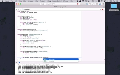 Now it's time to talk a little bit about the chain of responsibility pattern. Now the chain of responsibility pattern has probably the longest name of any of the patterns that we will be covering or have covered so far, but it's really not that daunting and once you understand the basic premise, the concept kind of flows fairly naturally. So let's start by creating a playground, and this is going to be the chain od responsibility pattern, or the core pattern, and what we wanna do now is make sure that we put this into the behavioral folder. Okay, so what we wanna do is start with the basic idea. And the basic idea here is that we can create a bunch of different actors in this particular pattern that are capable of all understanding some sort of request that is flowing through a pipeline if you wanna think of it that way. But only certain types of actors are able to take action on that particular request. So if a request comes through the pipeline and an actor can act on it, it will process that request. And then everything else after that will leave it alone or has the option of leaving it alone. And if that particular actor can't process that request, then it just continues down the pipeline. So let's go ahead and start to create something like that. And the basic idea here is we're going to create a simple support type organization application that will allow us to create support requests and have the series of support reps that may or may not be able to process that request. So the first thing we're going to do is we're going to create a enumeration that's going to be severity. So we will all be able to create different levels of severity and attach them to these requests. And let's just create a couple of these. We'll say we have a low, is going to be equal to 1, and we have a medium and a high. And then after that we have the concept of a request. So let's go ahead and create a class and this is going to be a SupportRequest. And within here we have a couple different pieces of information. We're going to have that severity that we just created. So that's what's going to dictate how important this is going to be. We can give all of these a name. So let's say this is going to be a name, and then we also are going to have a flag in here as to whether or not this particular action has been completed. This is gonna be a Boolean and by default it's gonna be false. So we are assuming that when we create this request initially, it's going to be false because we haven't actually completed it yet. Then let's create an initializer for both the severity and the names. We'll do name first and then the severity, which is going to up-type severity. And then we'll just initialize name = name, and then self.severty = severity. So now we have our basic SupportRequest class. Now we need some actors or some people that can act on these requests. So before we do that let's start by creating some protocols so we're speaking the same language across the board. So we're gonna start by creating a protocol called a support rep protocol, which is basically going to represent anybody that can handle support requests. And this is going to contain a function called processRequest, and that's going to take in a request of type SupportRequest. So probably nothing too overly complicated, or something that you don't quite understand that you can probably start to see where this is going. So then, what we wanna do, is we want to create a class called SupportRep, which is going to be a SupportRepProtocol. Okay, so now what we can do is we can start to create this class for the SupportRep. And we can start to dictate what this person is capable of doing. This person is going to have a particular level. That means that, this is maybe a junior level, or a senior level, or a mid level. Or maybe it's level one, level two, level three, or whatever sort of support structure you are familiar with and then a severity to which that support rep can handle. And then it's also going to have another concept in there which is going to enable this chain of responsibility kind of concept. And that's gonna be that it's going to know who or what the next level of the support organization is going to be. So we kinda have this chain of command. We start low at the junior level, and then we move up higher to the senior level. So lets start building this out, we're gonna start by creating a couple properties. So we're gonna need to specify the severity that this particular rep can handle. We're going to give this rep a level name so we could call it things like junior, or mid, or senior, things like that. And then it's also going to need to know about the next level rep. So who is the next one in line if this particular one can't process the request? And there may or may not be one. So we're going to specify that it can be optional, because we don't know that this is the last line of defense or not. So then, of course, we will go ahead and initialize here. We'll set the severity, is going to be a severity type. Then we'll also go in to set the level, which will be a string. And then we'll go ahead and set those properties. Okay, so that handles all of the initializations. But there's still some pieces of functionality we need to be able to handle. The first one is we wanna be able to set that next level support rep if we possibly can. So we'll just create another function here called set NextLevelRep, which is going to take in that NextLevelRep of types support rep. And then all we're going to do is set that NextLevelRep equal to the one that we're passing in. Okay, so that'll take care of that one if necessary, and then we need to be able to process that request if possible. So the way that we're gonna handle this is the first thing we need to do is check to see is this request already been processed, and if it has we're just going to let it go. So we'll say if request.completed then we're just going to return. We don't wanna do anything w