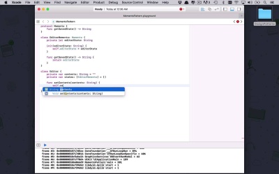 In this lesson, we're gonna take some time to learn a little bit more about the memento pattern. And the memento pattern sounds like kind of fancy, I suppose. But the concept is actually fairly simple and there's other little bits of the basic concept behind this sprinkled in a couple different other patterns, but the basic idea here is that I want to be able to save the state of any particular object at some point throughout the application. But not only do I want to save it, but I wanna be able to kind of go back in time and apply the saved state or the snapshot to my current instance of my object or of my class and just kinda have it overwrite and take it back to that point in time. So when I think of a sample like this or when I think of a pattern like this, I kinda start to think of maybe like a text editor or that style of an application where I can start to put things into my editor. And then I can save it and then I can undo, and kind of unwind what I've done so far, and be able to display that on the screen. So, let's go ahead and see what that's gonna look like. So, we're going to create a MementoPattern playground and let's stick with that concept of I want to be able to create some sort of editor or something like that. So, that's kind of the loose ideal we're going for. So, let's create a protocol here and let's create this memento protocol. And the basic idea here is that at any point during the life of my object that is going to implement this protocol, I wanna be able to get a saved state. I wanna get whatever that information is that I've saved off. So, I'm gonna create a simple function here called getSavedState and this is simply going to return a string for this particular application. Because like I said, we're kind of building a basic text editor type of an application. So, the first thing I wanna do is I wanna create my memento implementation. So, this is gonna be an EditorMemento and it's going to implement or it's going to use that memento protocol. And so, let's do a couple of things in here. So really at this point, I wanna be able to save the current state of my editor. So at any point in time, I wanna be able to create a memento that's going to take a snapshot of what my editor looks like at that time. So obviously, I'm gonna need a way to store that. So I'm gonna say that I'm gonna save my editor state, which is going to be a strain since that's all I'm really concerned about at this particular time. And let's create an initialize and just say that's it's going to take it in the editor's current state, so I can initialize that. Good, so we have that initialization. But we also need to retrieve that saved state, so we can simply return the editor's state. So, that's the basic concept of this memento. This is gonna take that snapshot and be able to retrieve that snapshot from wherever I was at that point when I took this snapshot. So, let's go ahead and create our editor class. This is gonna be our fancy schmancy editor that we're going to be able to put text into. So when we're talking about that text, that's really the contents of the editor. So we're going to have a variable here called contents, that's going to be a string. And initially, it's going to be empty. So, I just startup my editor. There's nothing in there and then what I want this editor to be able to do is to periodically, when I choose or maybe when we have some fancy logic in there that every so often, every five seconds or something like that, it takes a snapshot. It takes a memento from my application, but we need a way to kinda store all of those. So, we're gonna create a private variable. This is going to be an array of states, which are really just going to be editor mementos. And just like the contents, it's gonna start out empty since there's really nothing to save or we haven't saved anything when we just started out our editor. So, let's set up a couple of help functions here. So were going to say, setContents. So imagine, this is the function that gets called when we start tying in there. So, the setContents is gonna continually update the contents of the screen. So, this is just our mechanism into that world. So we're gonna pass in contents and this is going to be a string. And then all we're gonna do is say, self.contents is gonna be equal to contents. So we're constantly being able to update the contents and what show up on the screen, then we need a couple of operations. So, any editor is going to allow you to do some sort of save function. Now, the thing that could be a little bit confusing here is it doesn't necessarily mean that I have to click the Save button for this to save in my application. Remember in a lot of applications, especially cloud-based word processing applications, there's usually something going on in the background that every so often it just starts to save the contents and maybe it could be something like that. You can use your imagination. But anyway, we're gonna go to our states. And at this point, we're going to append onto there. We need to create an new editor memento. So, we're going to create an edit memento and this is going to take the current contents of our editor. So at any point in time, when the save function is called, we're gonna take a snap shot of our editor and we're going to append it to the state. So, we can kinda see all the different states that we were in along the way. And then at any point in time, we could undo our current state and kind of take whatever that last saved state was and make it the current state. So we're going to create an undo function here, so we need to get the last state. So we'll say, let last state be equal to. So the equivalent of pop, if we were using a stack, the last state off and use that as the current state. So the way that we can do that with an array is simply go into states and say, I want to removeLast. RemoveLast will take the last thing that we added off of the array and give it back to us. So no