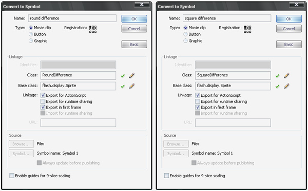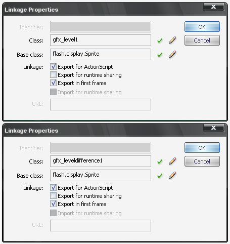 First we create two symbols that hold the graphics. Use Insert > New Symbol and create two symbols: gfx_level1 and gfx_leveldifference1. Also export these as shown below. For reasons explained in the next step it is important that all symbols used for level graphics are named correctly. We use the base class Sprite because the container will not need a timeline for animation. Inside these containers you could draw up the levels with vector graphics, or import some bitmap graphics and place them there.